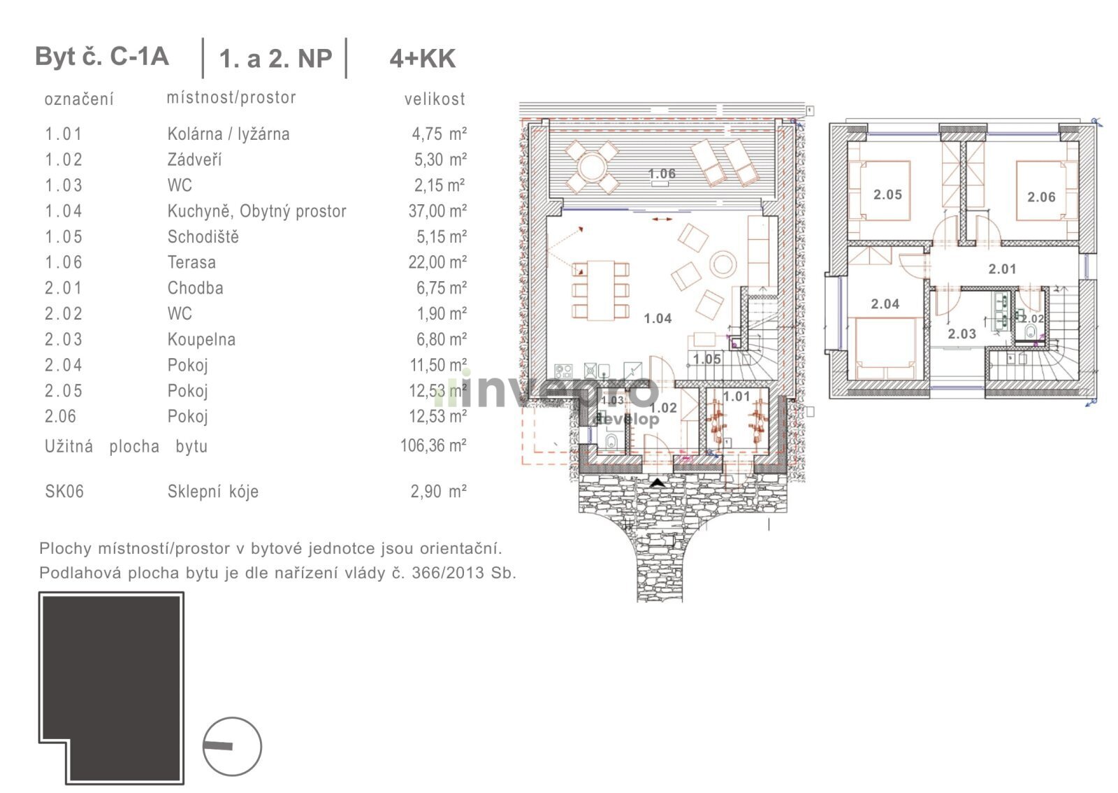 Samostatný dvoupatrový apartmánový dům o dispozici 4+kk a užitné ploše 106,4 m2. Je tvořen zádveřím, kolárnou/lyžárnou, obytným prostorem s kuchyňským koutem, třemi pokoji, koupelnou, dvěma WC a terasou o výměře 22 m2. Samozřejmostí je sklepní kóje (2,9 m2) umístěna v 1. PP budovy A.